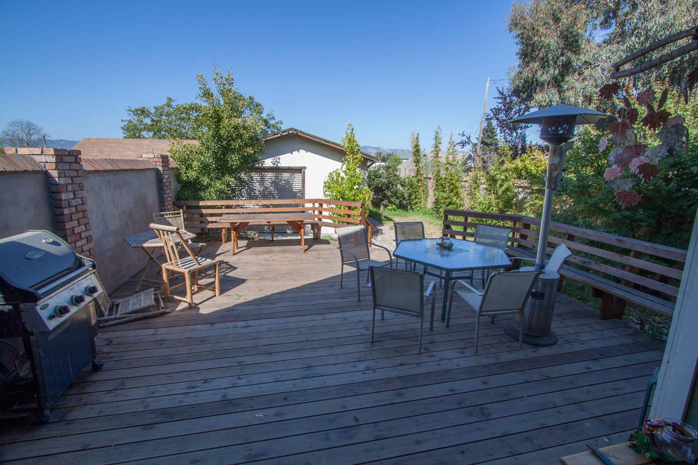 Back downstairs, here is the view from the back door. A large deck with built-in benches makes for great outdoor living.