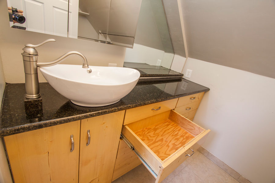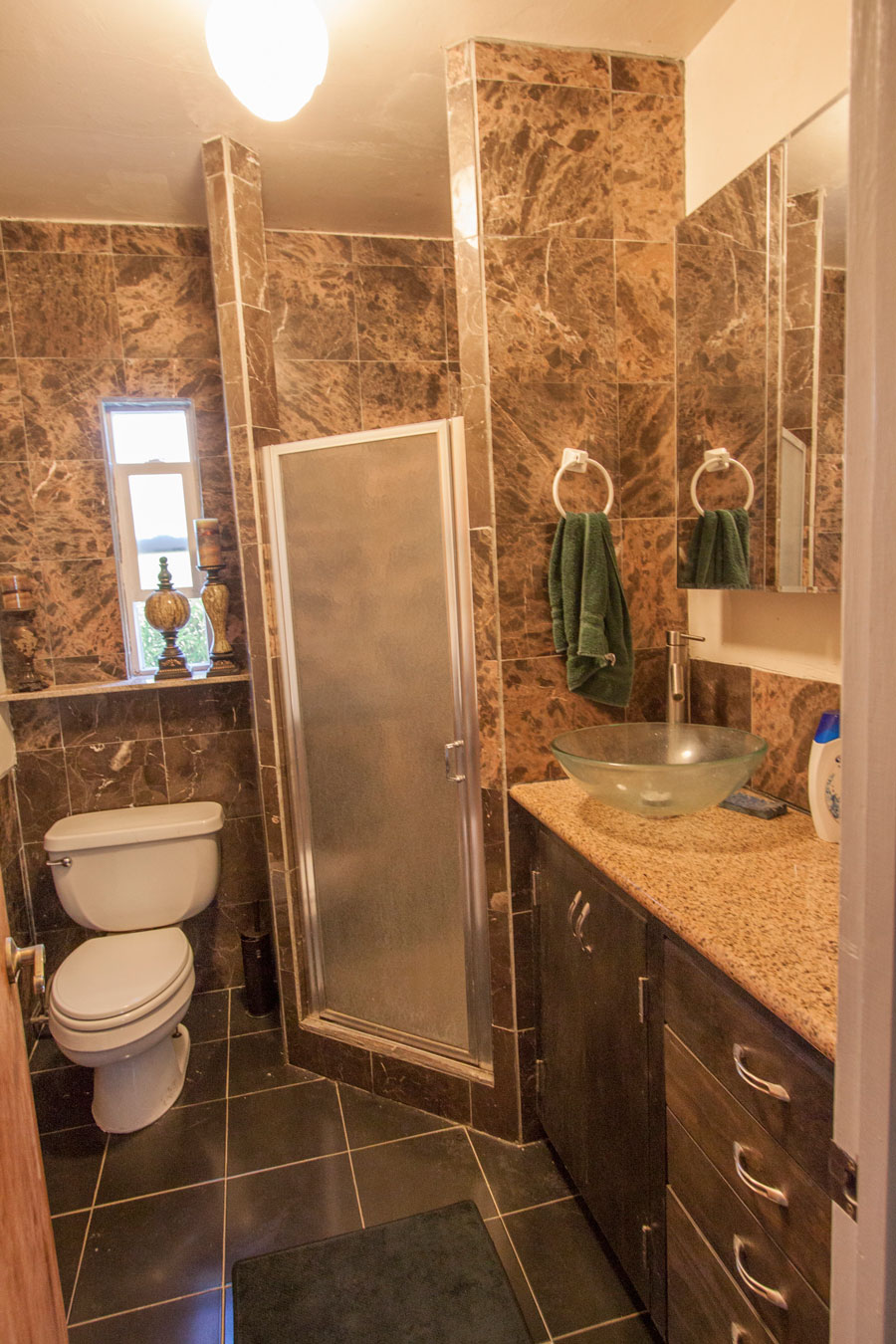 This bathroom, next to the third bedroom is granite and marble. It has lots of storage.
