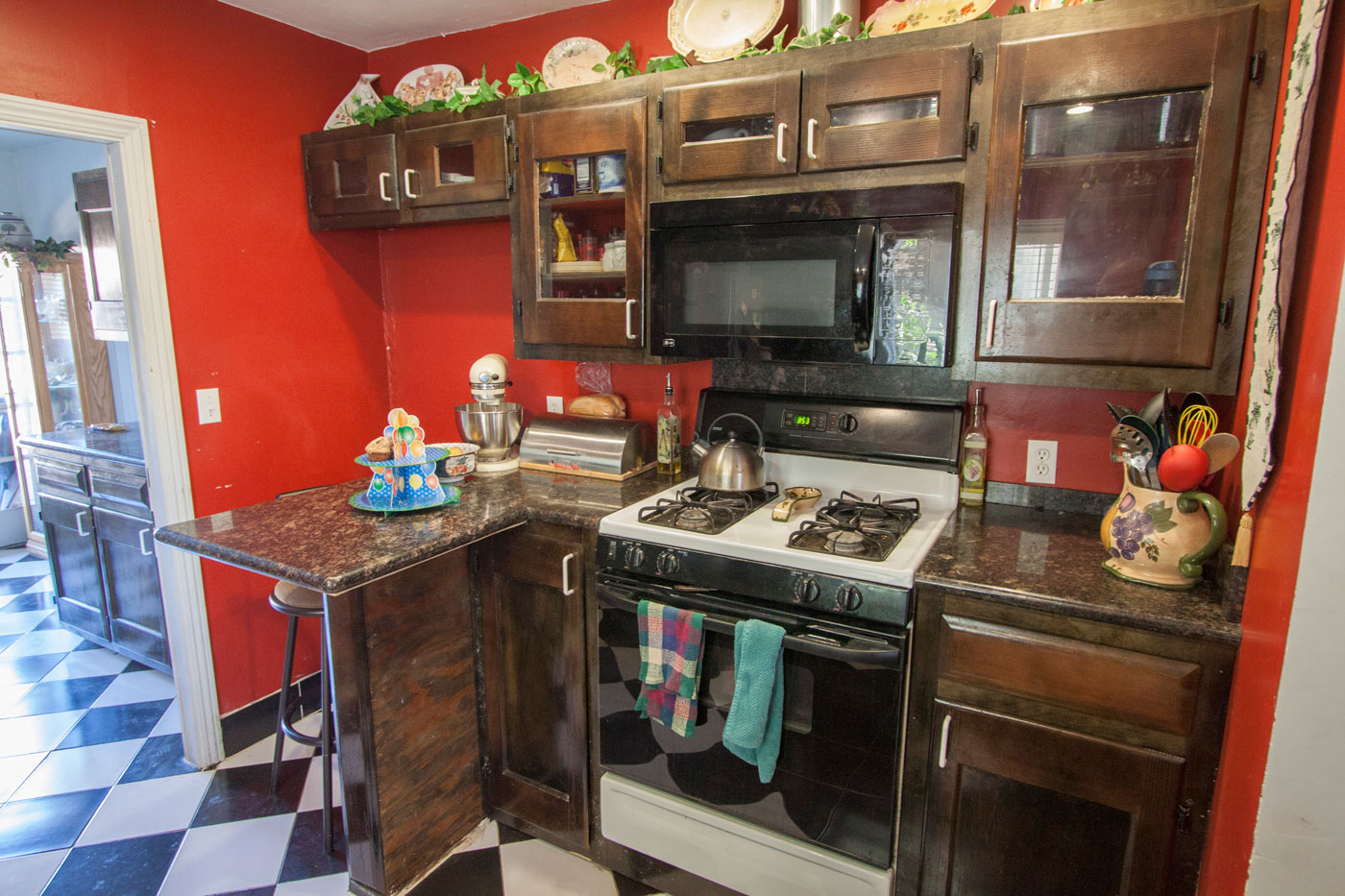 Gas range with built-in microwave and small breakfast bar completes the kitchen. Additional counters and storage are in the adjacent hall.