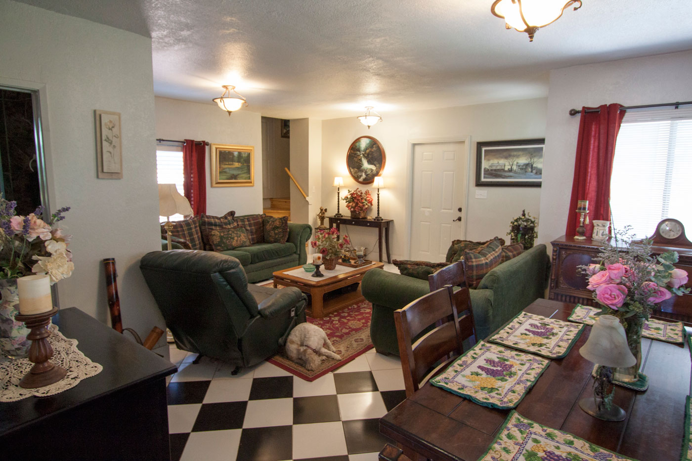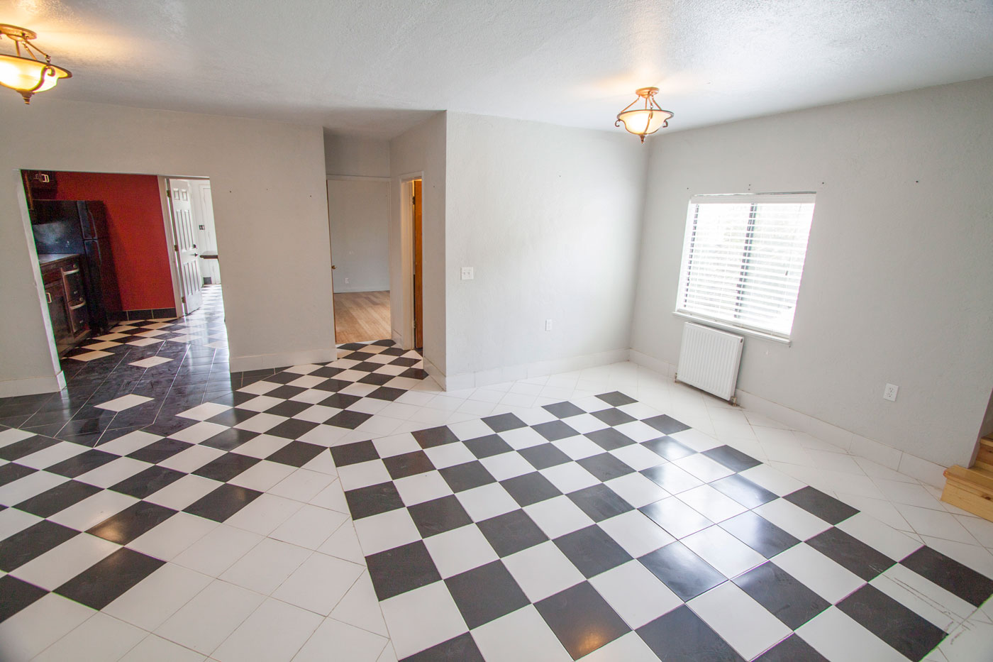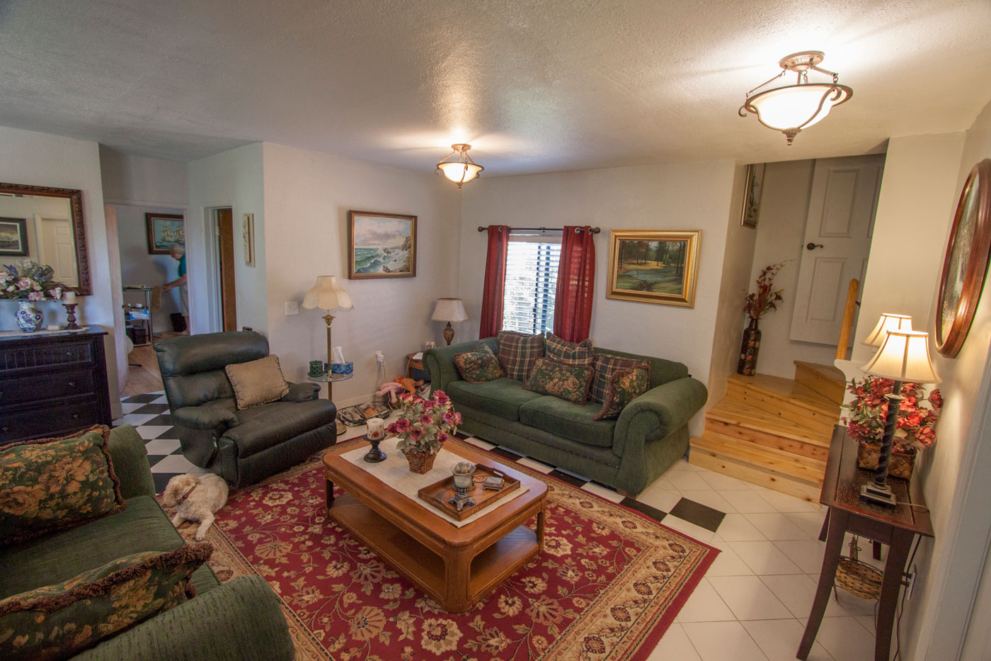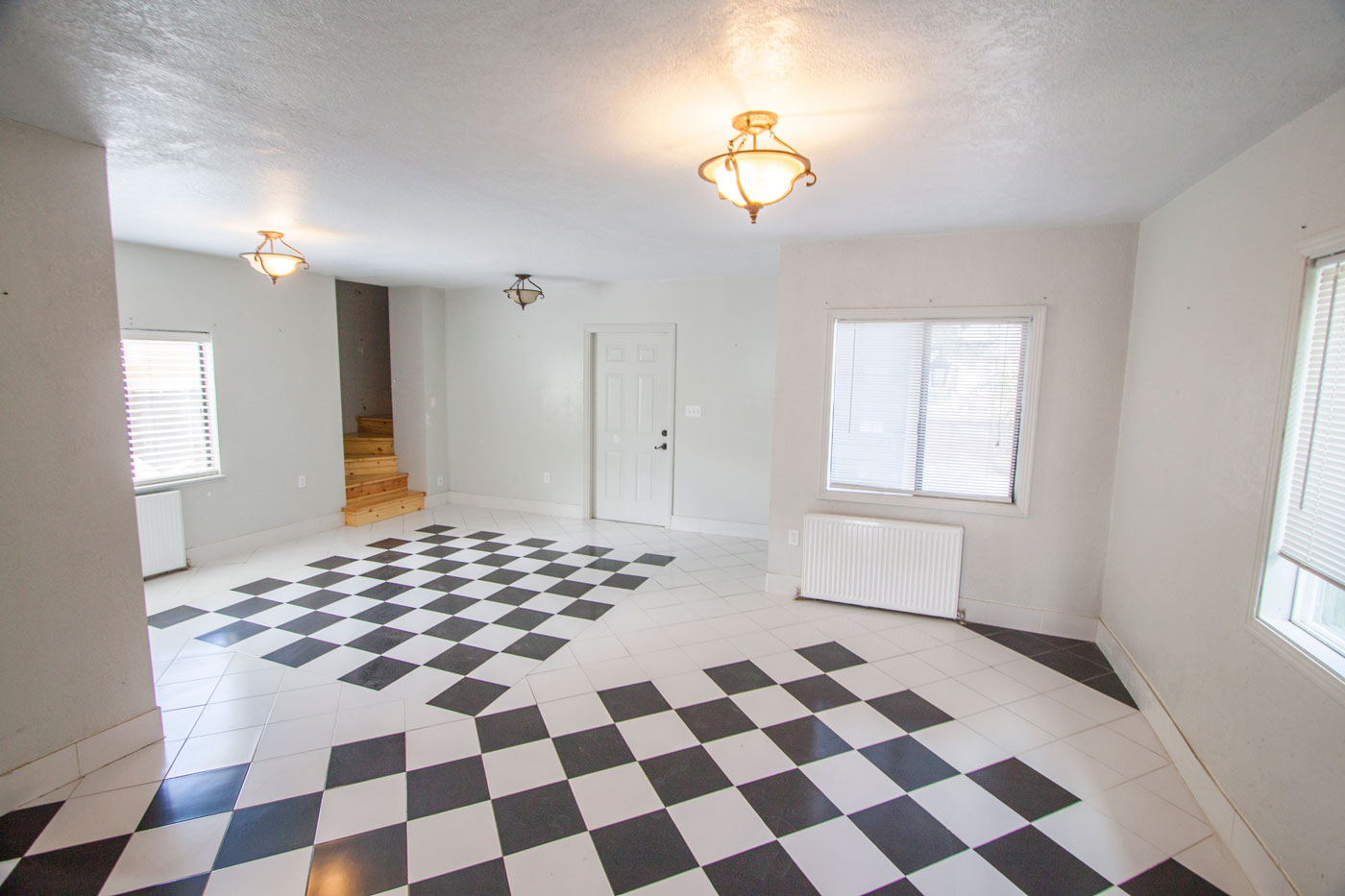 Here is the view from the front door with and without furnature. The garage is on the right, steps going up directly across and living room to the left.