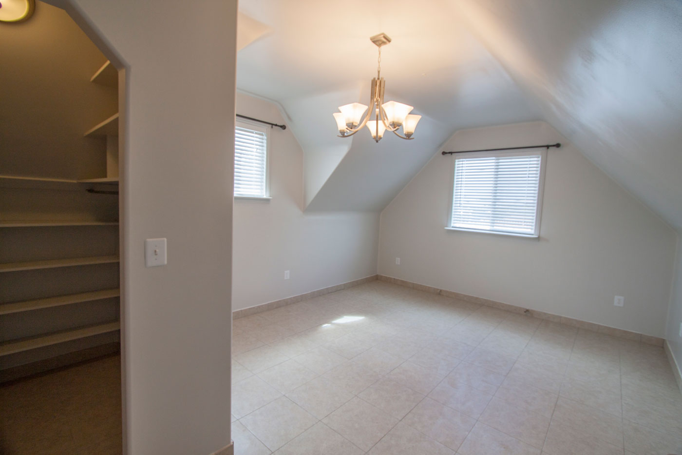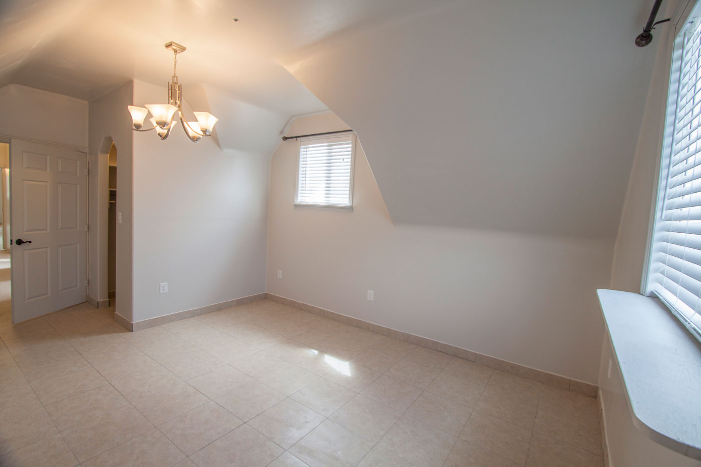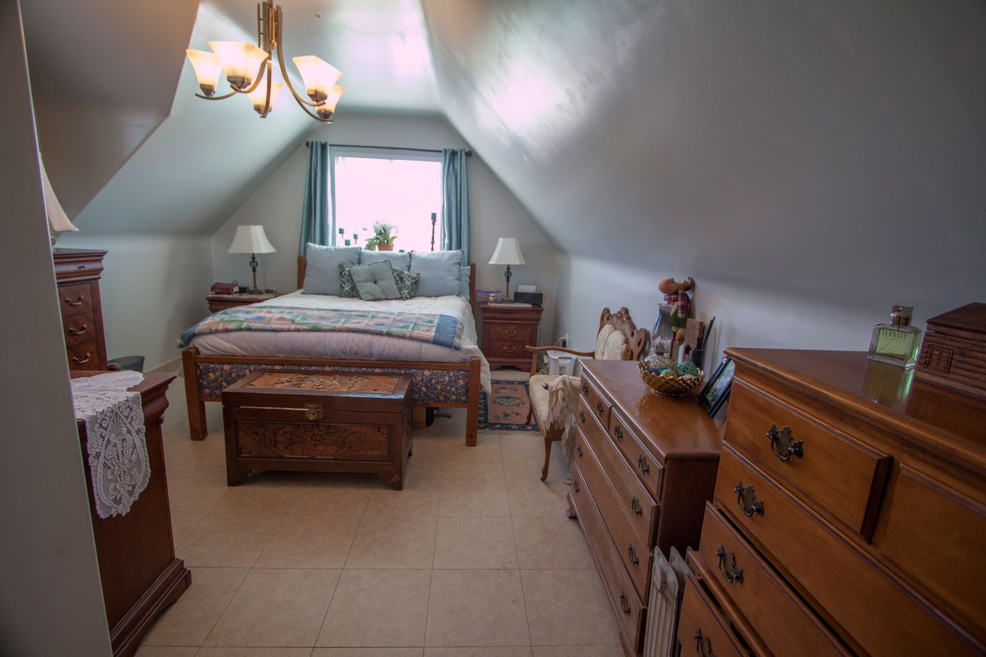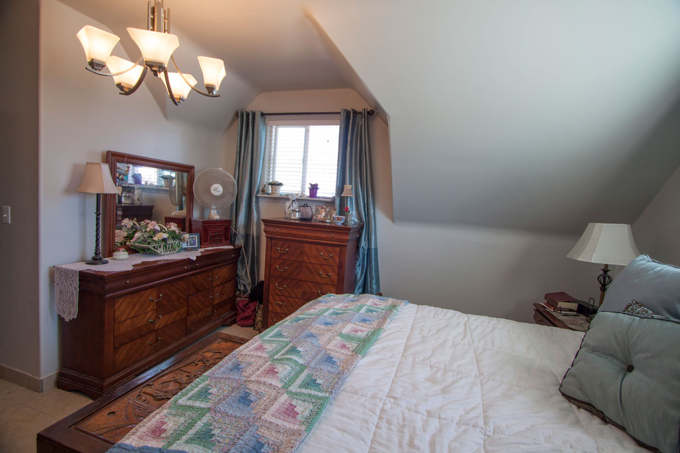 The master bedroom is about 19' x 16' but with an interesting shape. With tall ceilings and sloping sides, the room can hold a lot of furniture.