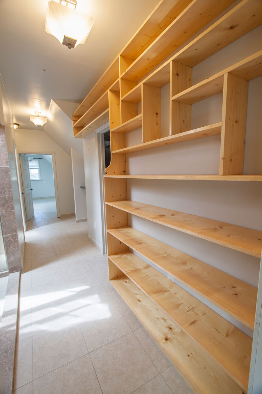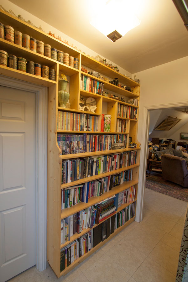 Finally a large built-in bookshelf finishes up the hall. Shown FULL and empty.