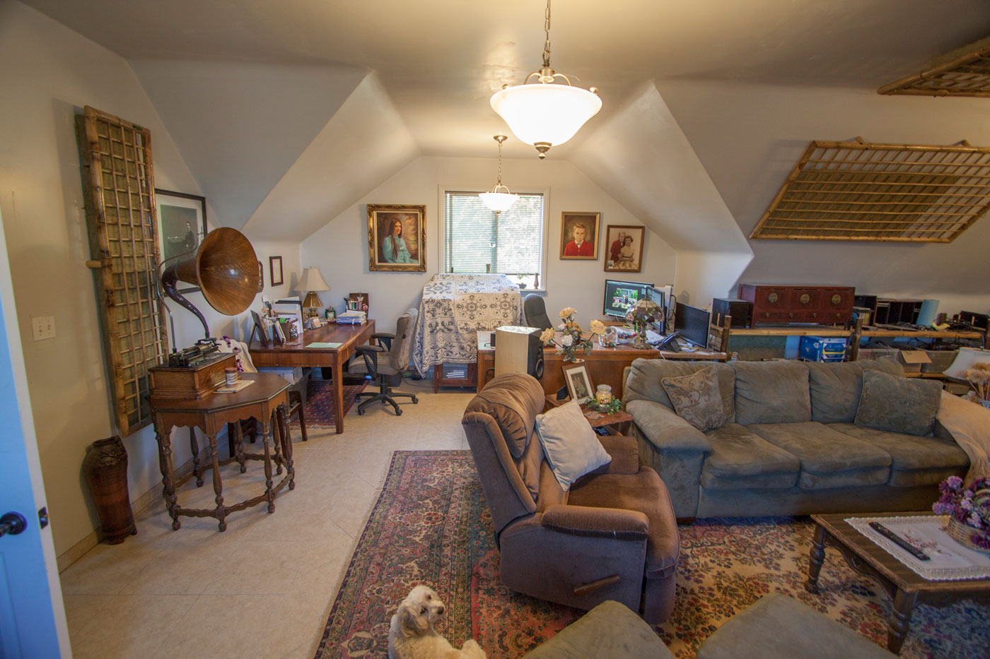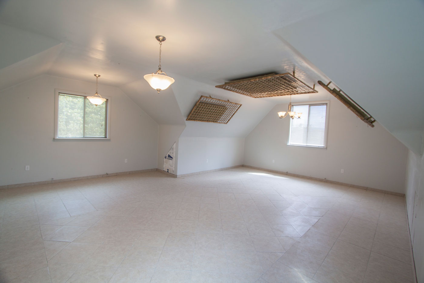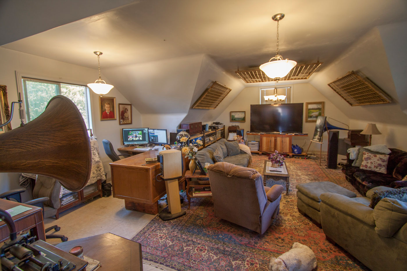 The rest of the upstairs is this 23' x 29' space that could be used for many things. We divided it as a home theater and office. Here is the view from the door. The theater end of the room has plenty of room for a full sized system, and a great living area. The acoustic panels on the ceiling provide perfect sound. For other uses they can be easily removed.