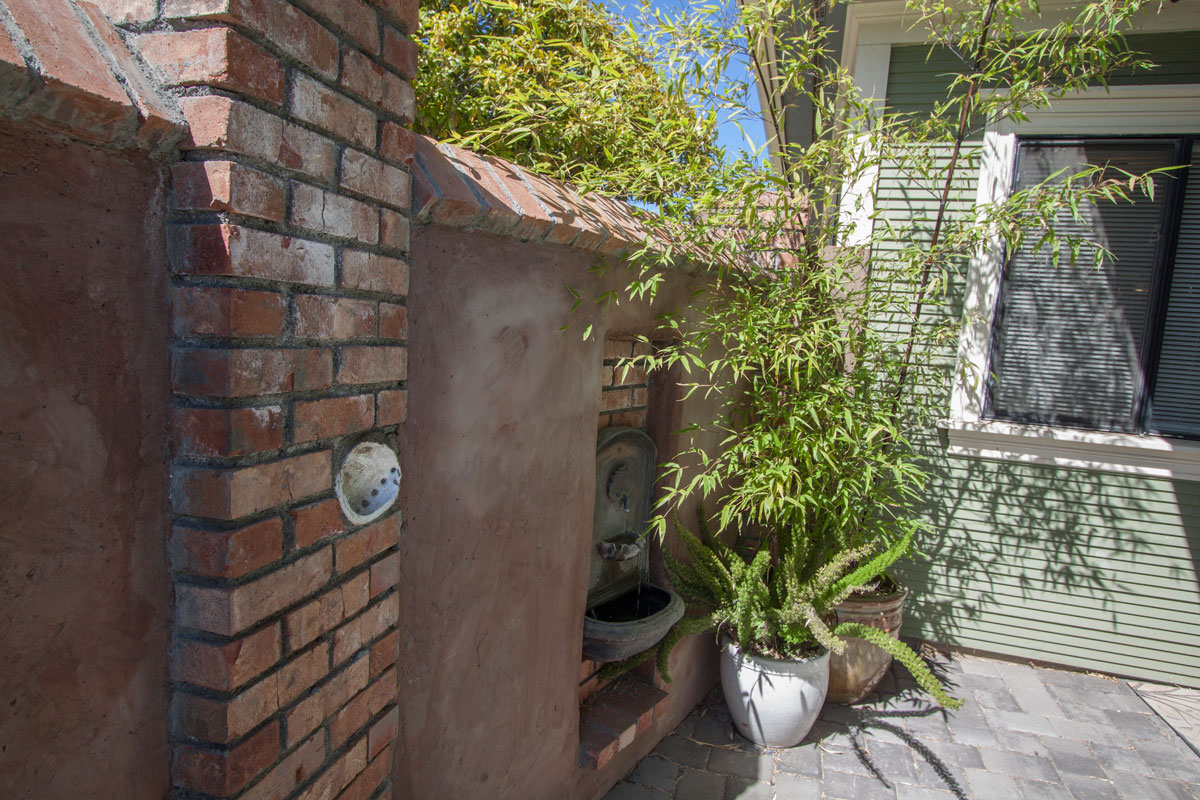 A fountain is located at the end of the courtyard next to the front door.