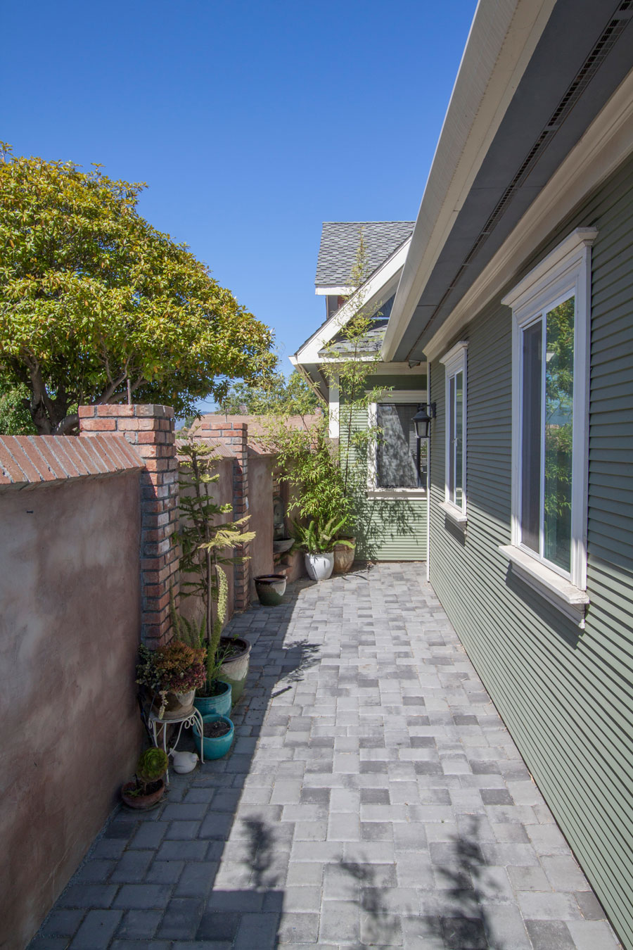 Here is the walkway to the front of the house. A perfect courtyard to be decorated with your favorite plants. Drip irrigation is included at each post so you never need to water.