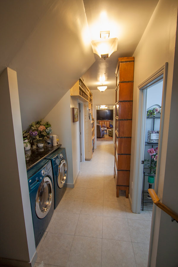 Before going outside to the back yard, lets look upstairs. Here is the main hall, with living area at the far end, bedroom behind us and our own personal laundry, bath, shower and dressing rooms.