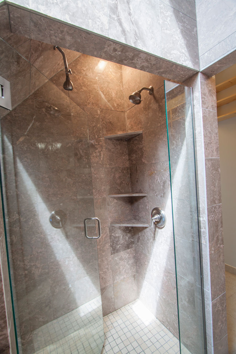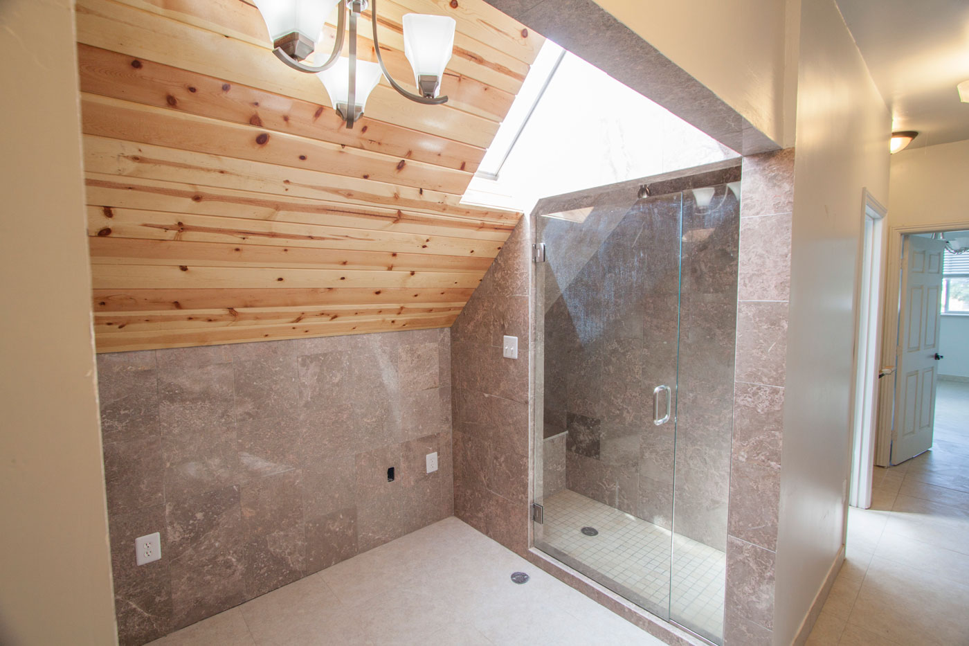 Next down the hall is the shower room. This marble room contains a luxurious shower with 2 shower heads and its own flash hot water heater for instant hot water. It also has an operable skylight.
