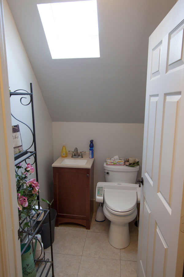 Next down the hall is the toilet with a small sink and operable skylight.